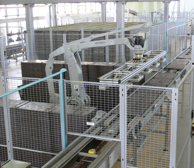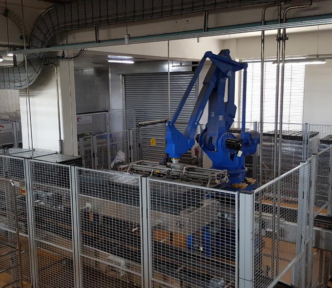 The Travelling conveyor pan store holds stacks of pans 10 to 12 high and one or two robots linked together are fitted with a beam holding magnets which lift 8 to 10 pans at a time and place's then down onto a heavy duty slat conveyor. When the stack height is made 10 to 12 pans high, the conveyor indexes back a pan length and the operation repeats itself until all the pan are off the system and neatly stacked. When production starts up the system simply reverses its operation until a sufficient number of pans are in the system loop. Both systems provide gentle handling of pans and take away operator fatigue maximising pan life, which reduces cost. The system will automatically remove pans or feed them back into the conveyor system should production faults occur keeping the pan loop operational at all times.