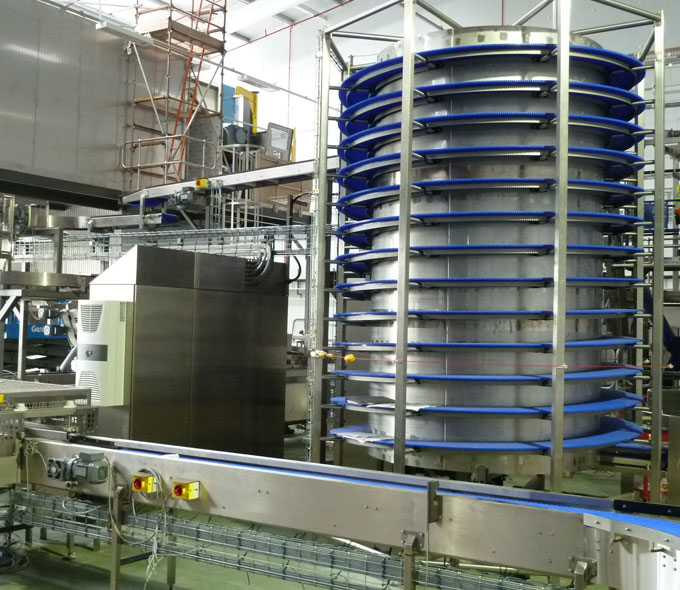 Dale’s spiral first provers are used on the makeup side of the process and transport dough in either single file or in double lane format depending upon plant capacity. Dough is gently pulled away from the belt at discharge via a stripping roller arrangement and then placed into a flip flop chute whereby dough is flipped onto one or the other separate conveyors leading to the mouth of each moulder.