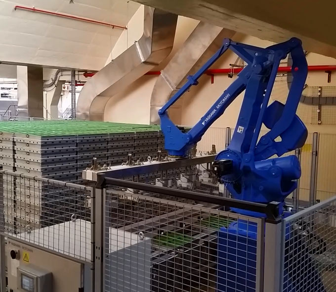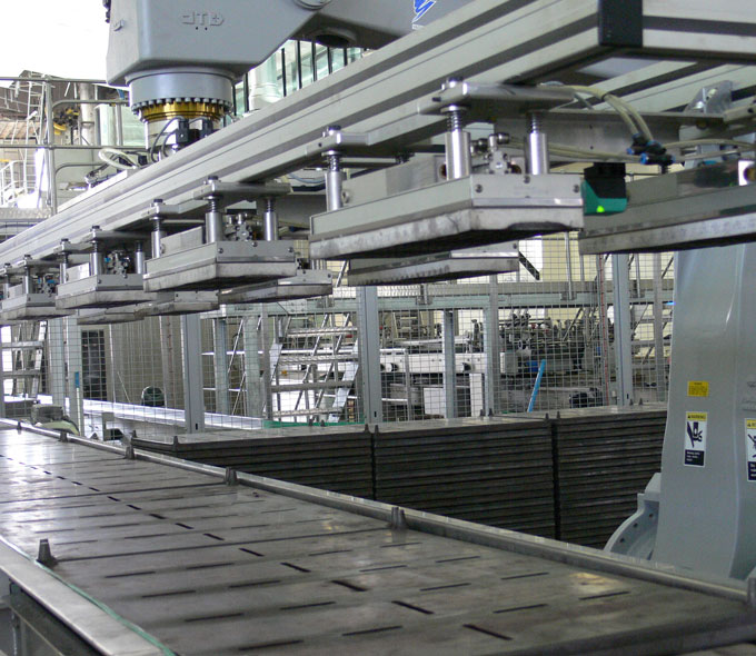 The Travelling conveyor pan store holds stacks of pans 10 to 12 high and one or two robots linked together are fitted with a beam holding magnets which lift 8 to 10 pans at a time and place's then down onto a heavy duty slat conveyor. When the stack height is made 10 to 12 pans high, the conveyor indexes back a pan length and the operation repeats itself until all the pan are off the system and neatly stacked. When production starts up the system simply reverses its operation until a sufficient number of pans are in the system loop. Both systems provide gentle handling of pans and take away operator fatigue maximising pan life, which reduces cost. The system will automatically remove pans or feed them back into the conveyor system should production faults occur keeping the pan loop operational at all times.